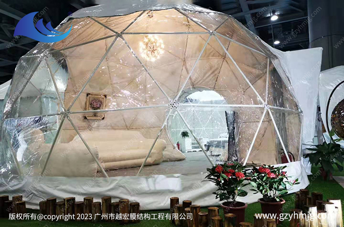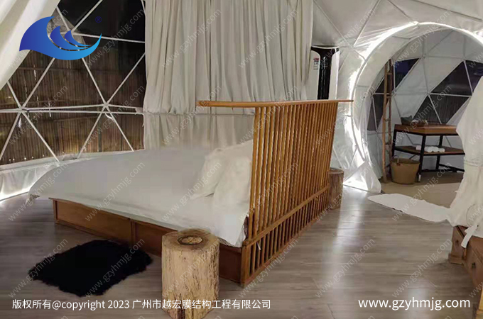 現(xiàn)在我們就看看江西某旅游景區(qū)所搭建的球形帳篷酒店,以半透明為主, 為客群提供高質(zhì)量的帳篷住宿體驗,讓旅客置身自然之中,無時無刻不被大自然的天籟之音和靜謐環(huán)境所包圍。越宏按照需求設(shè)計出一套直徑10米左右的球形帳篷酒店,內(nèi)部配套齊全,有桌椅、睡床、衣柜、沐浴間等等,透明篷布部分設(shè)計是為了更好的觀賞戶外風(fēng)景,以及在夜晚時刻能躺在床上觀望天上星星相伴入睡。帶來有更舒適的睡眠效果。