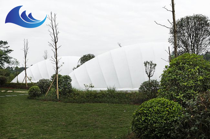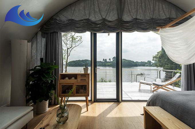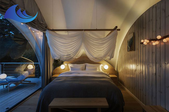 帳篷酒店采用高強(qiáng)度中空鋁合金結(jié)構(gòu)或者是鋼結(jié)構(gòu),表面具備有防腐處理,優(yōu)選膜結(jié)構(gòu)頂棚,安全耐用,防水、阻燃、防紫外線。
